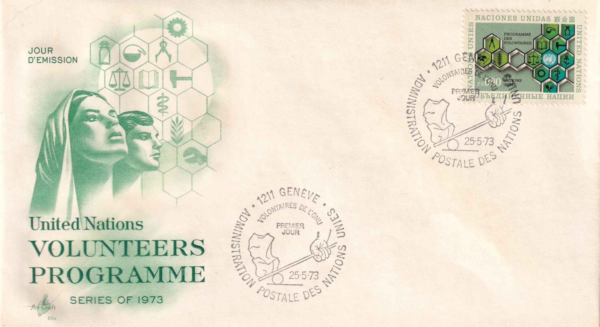 Denne originale FN-førstedagskuvert fra 1973 sætter fokus på FN’s frivilligprogram (UN Volunteers) og det internationale samarbejde om udvikling.