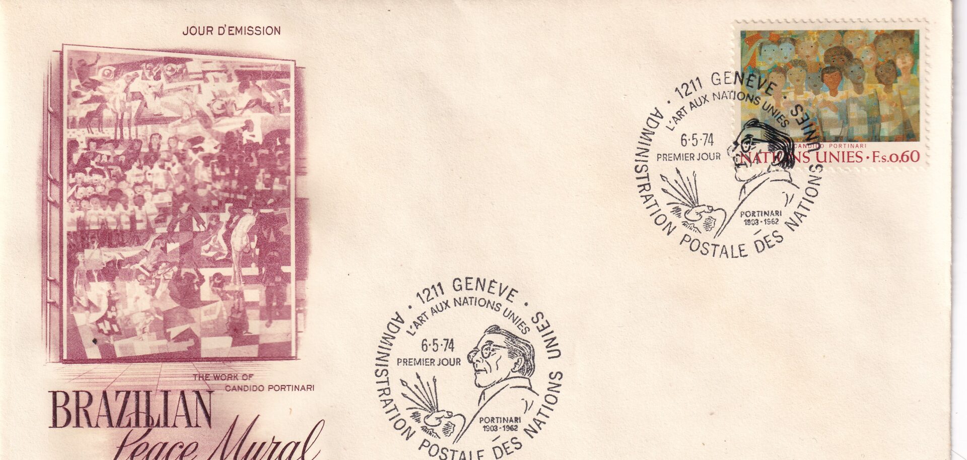 Denne smukke FN-førstedagskuvert fra 1974 hylder den brasilianske kunstner Candido Portinari, en af Latinamerikas mest betydningsfulde kunstnere i det 20. århundrede.