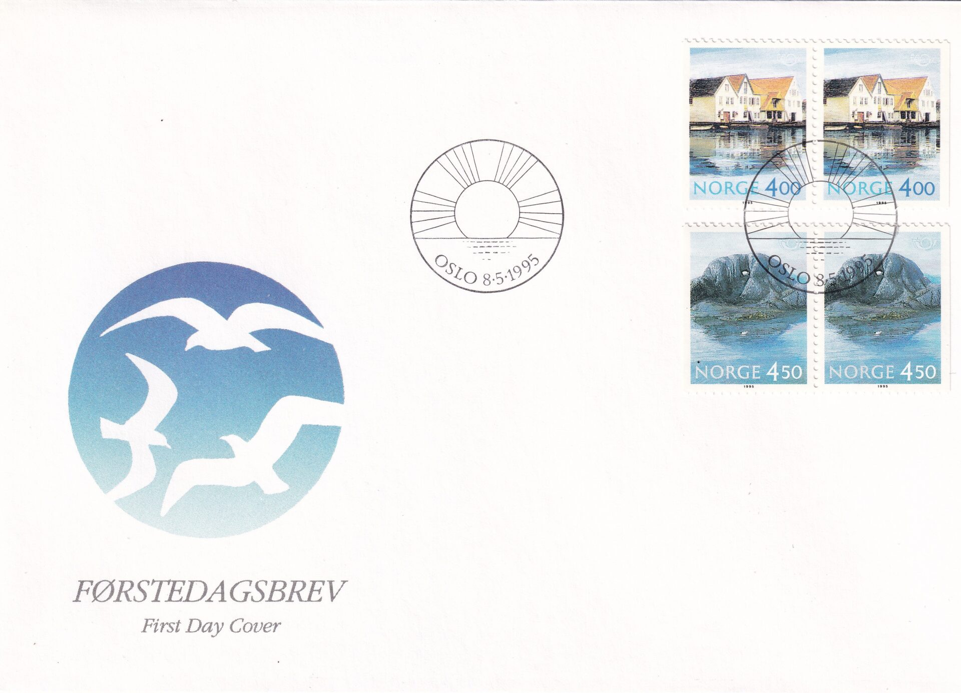 Officielt norsk førstedagsbrev udgivet den 8. maj 1995 med smukke motiver fra den norske kyst og havmiljø.