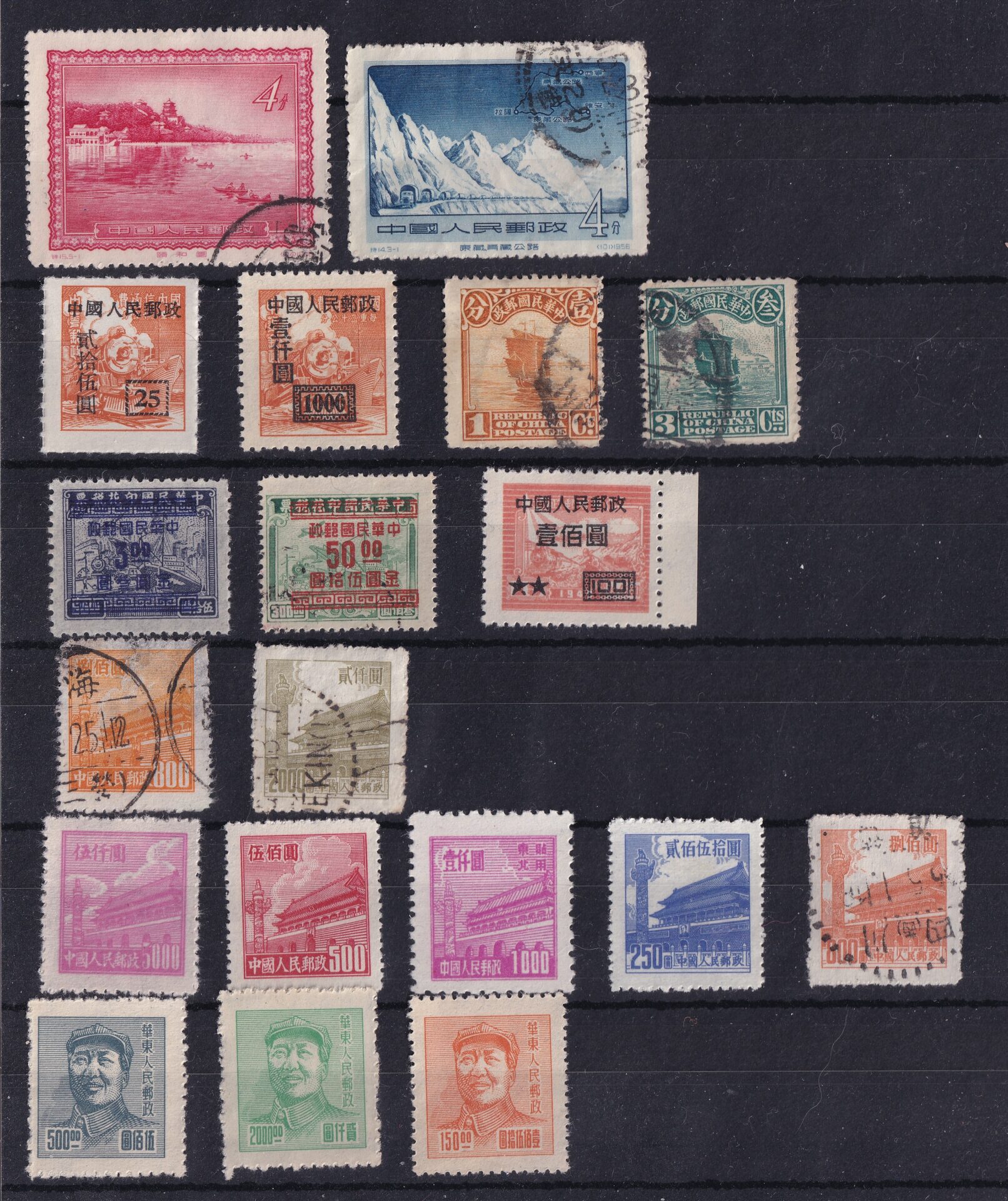 Spændende frimærkelot med kinesiske frimærker fra midten af det 20. århundrede, primært udgivet under Republikken Kina og Folkerepublikken Kina. Lotten rummer en varieret samling med både landskaber, arkitektur, skibe, Den Kinesiske Mur samt politiske og historiske motiver, herunder portrætter og symbolik fra den tidlige folkerepublik.
