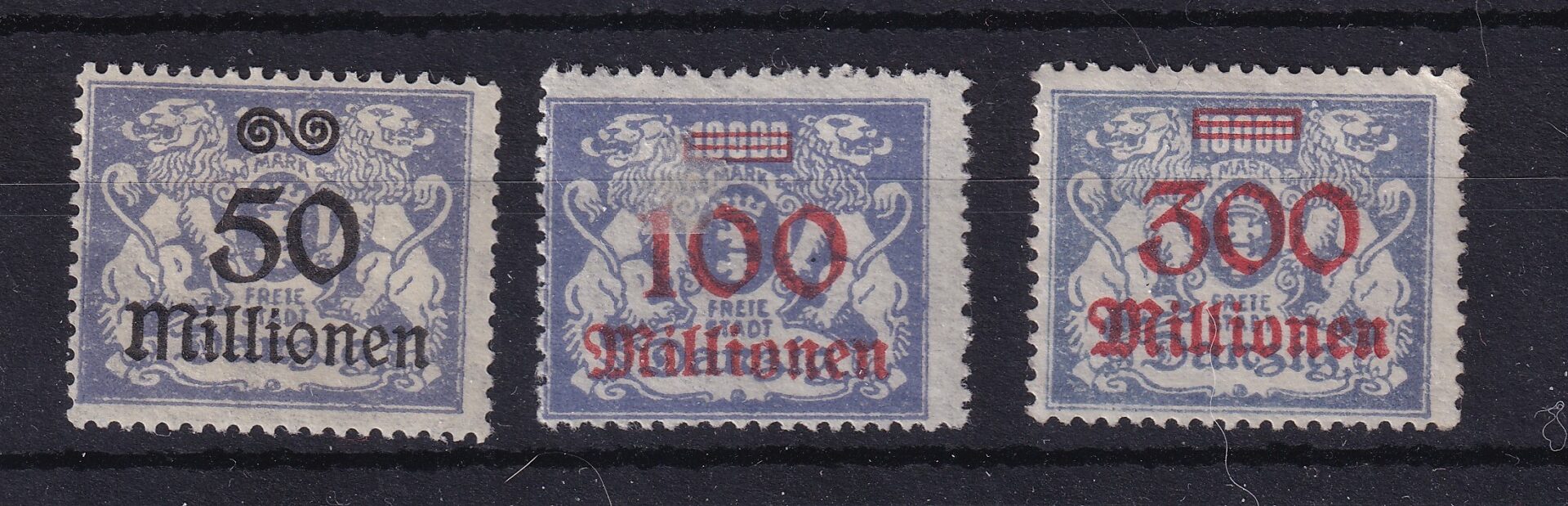 Parti af frimærker fra Fristaden Danzig udgivet under den ekstreme højinflation i 1923. Mærkerne er forsynet med markante million-overtryk og viser værdier på 50 millioner, 100 millioner og 300 millioner Mark. Udgivelserne er baseret på tidligere løvemotiver med våbenskjold og afspejler de hastigt stigende portotakster i inflationens slutfase.