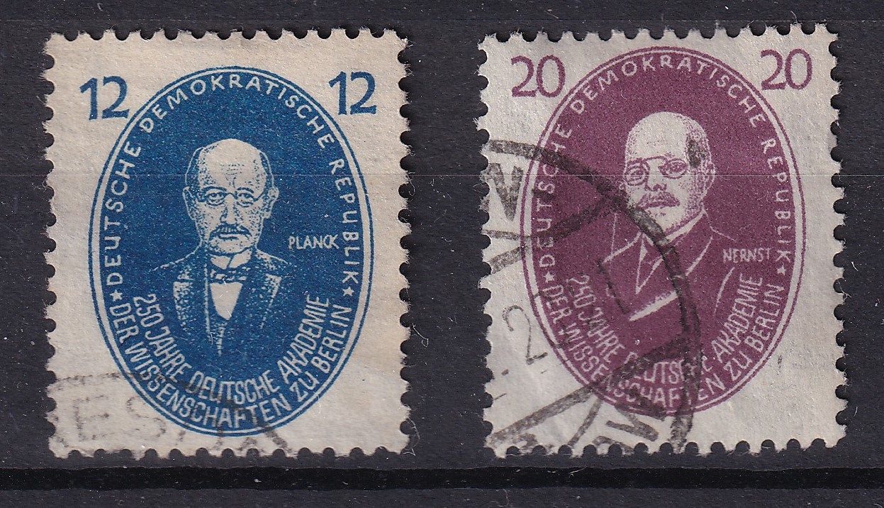 Disse to frimærker fra DDR er udgivet i anledning af 250-året for Deutsche Akademie der Wissenschaften zu Berlin, en begivenhed som Østtyskland brugte til at hylde videnskabens store navne. Motiverne viser to fremtrædende fysikere: Max Planck på det blå 12-pfennig-mærke og Walther Nernst på det violette 20-pfennig-mærke. Begge skikkelser er gengivet i et enkelt, ovalt portrætformat omgivet af akademiets navn, og de tydelige stempler understreger mærkernes brug i samtidig postgang. Samlet repræsenterer de et klassisk eksempel på DDR’s tradition for at ære videnskabelige pionerer gennem sine frimærkeudgivelser.