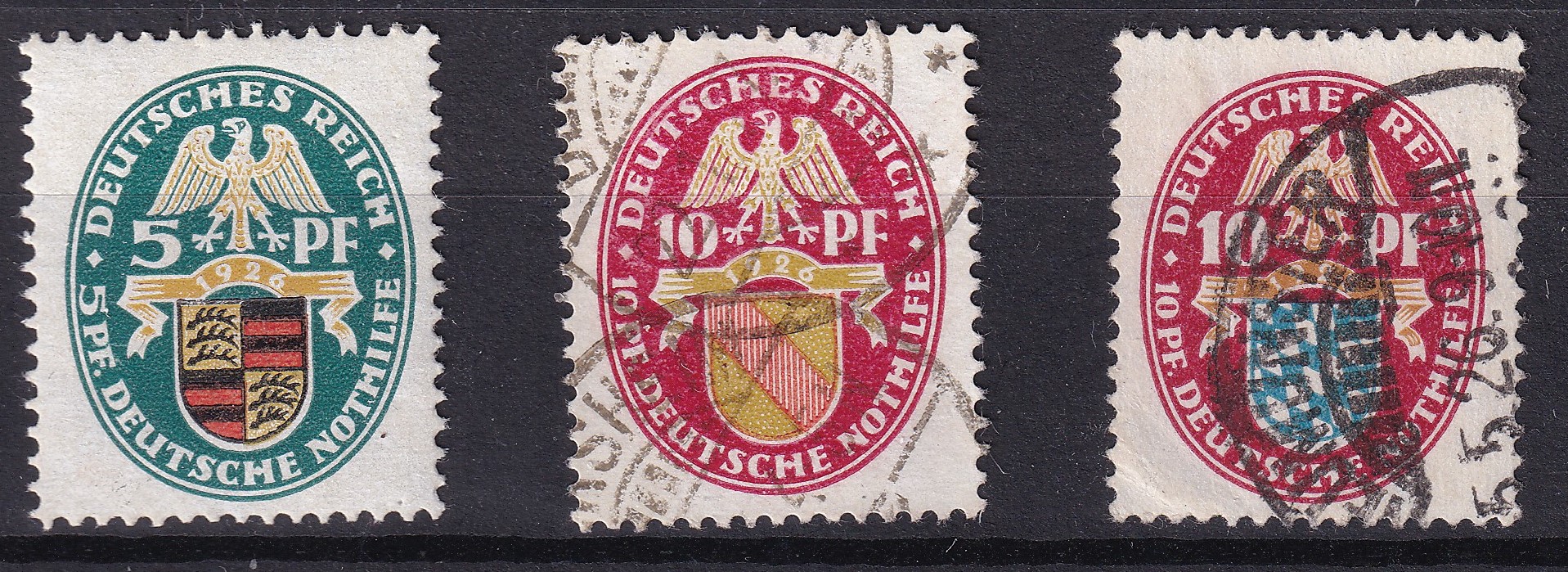 Disse frimærker stammer fra den tyske Nothilfe-serie fra 1926, en velgørenhedsudgave, hvor en del af portoen gik til social og økonomisk nødhjælp i Weimarrepublikkens økonomisk hårdt pressede år. Serien er kendetegnet ved sin elegante, ovale udformning og kombinationen af den tyske rigsørn øverst og de tyske delstatsvåbener nederst, som symbolsk binder nationen sammen i et fælles hjælpeprojekt.