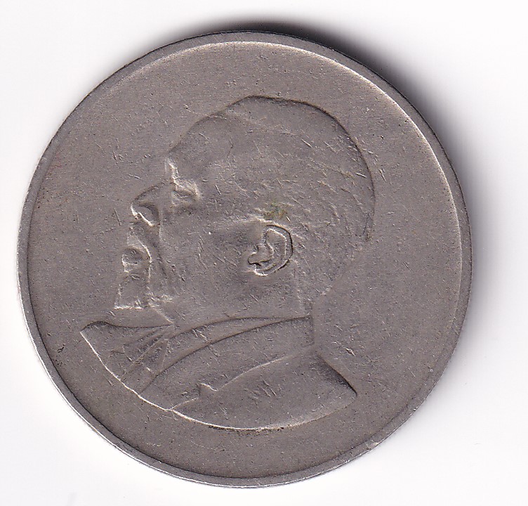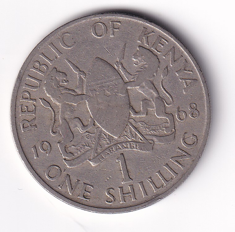 Denne mønt fra Kenya har pålydende værdi 1 Shilling og er præget i 1968, få år efter at landet opnåede sin selvstændighed fra Storbritannien i 1963. Mønten tilhører de første serier af mønter udstedt af den nye republik, hvor landets første præsident, Jomo Kenyatta, blev afbildet på mønterne som symbol på den unge nations identitet.