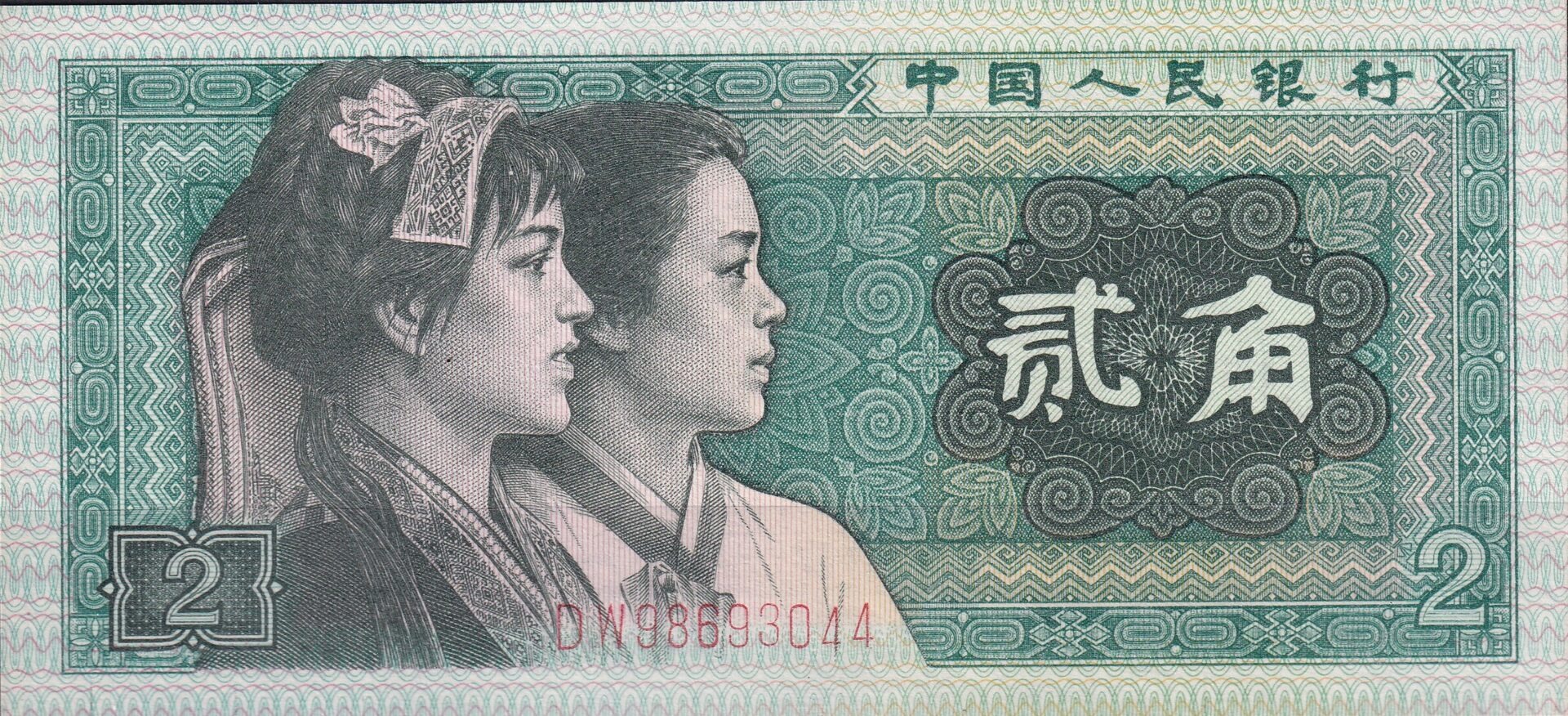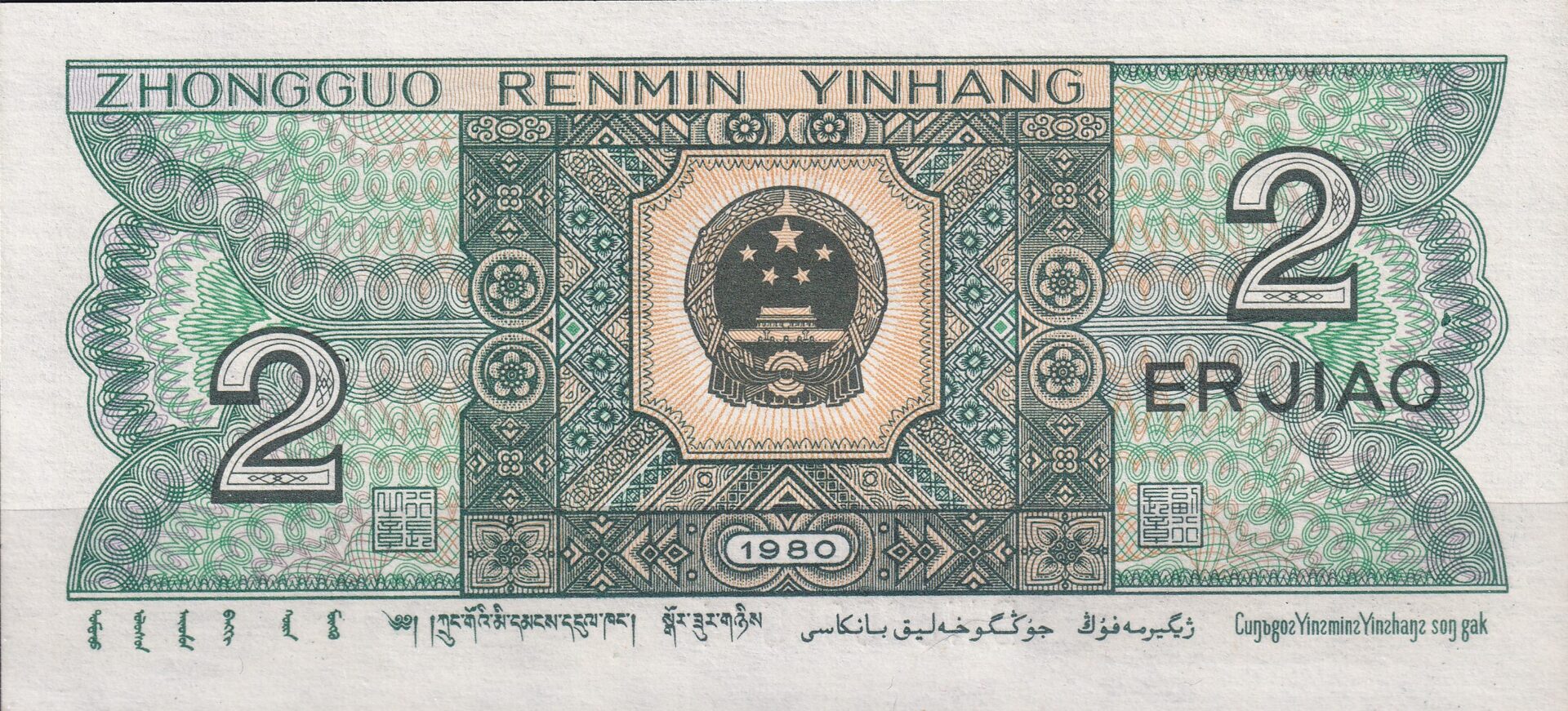 Denne 2 jiao-seddel fra Kina (1980-serien) er et flot eksempel på den klassiske stil, der kendetegner kinesiske pengesedler fra perioden.