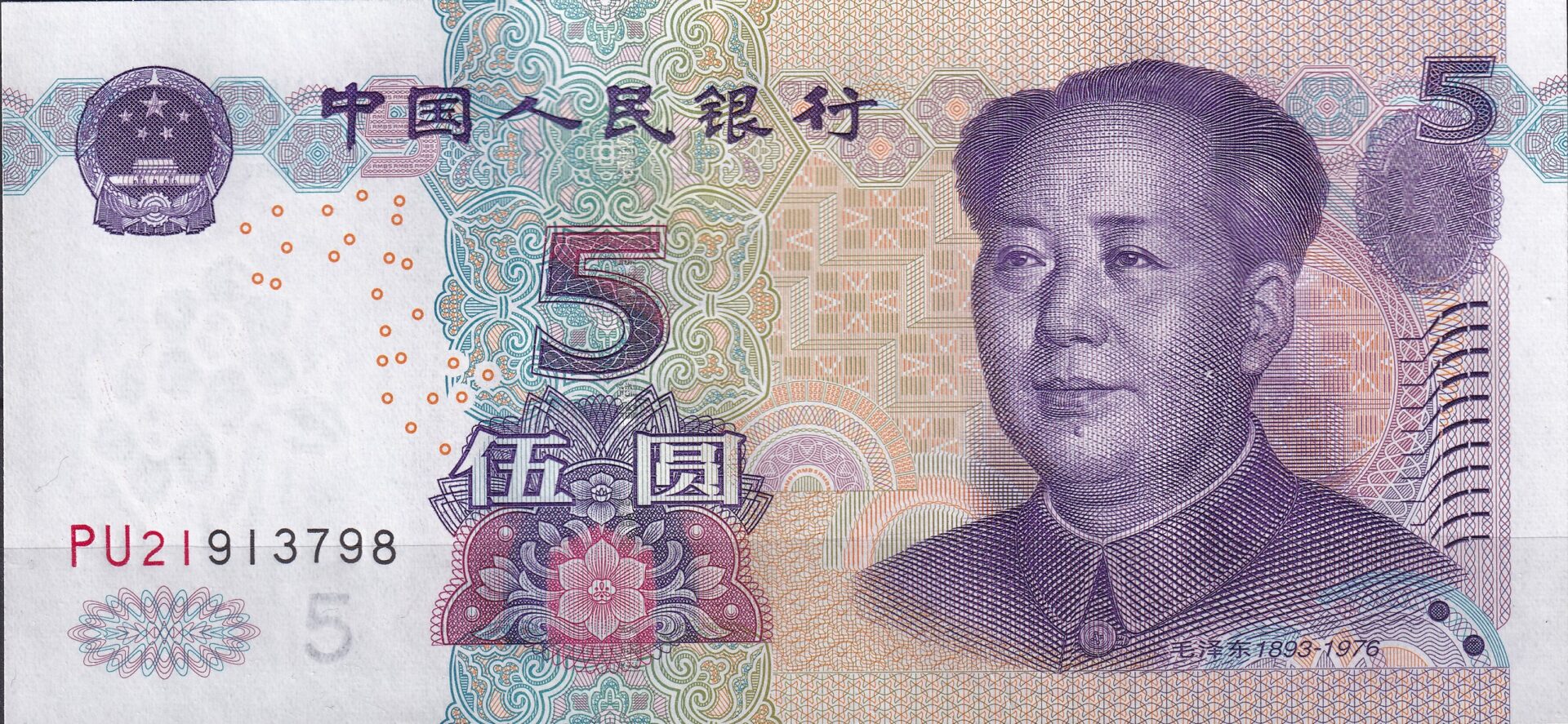 Flot kinesisk pengeseddel på 5 Yuan med portræt af Mao Zedong og klassisk landskab på bagsiden.
