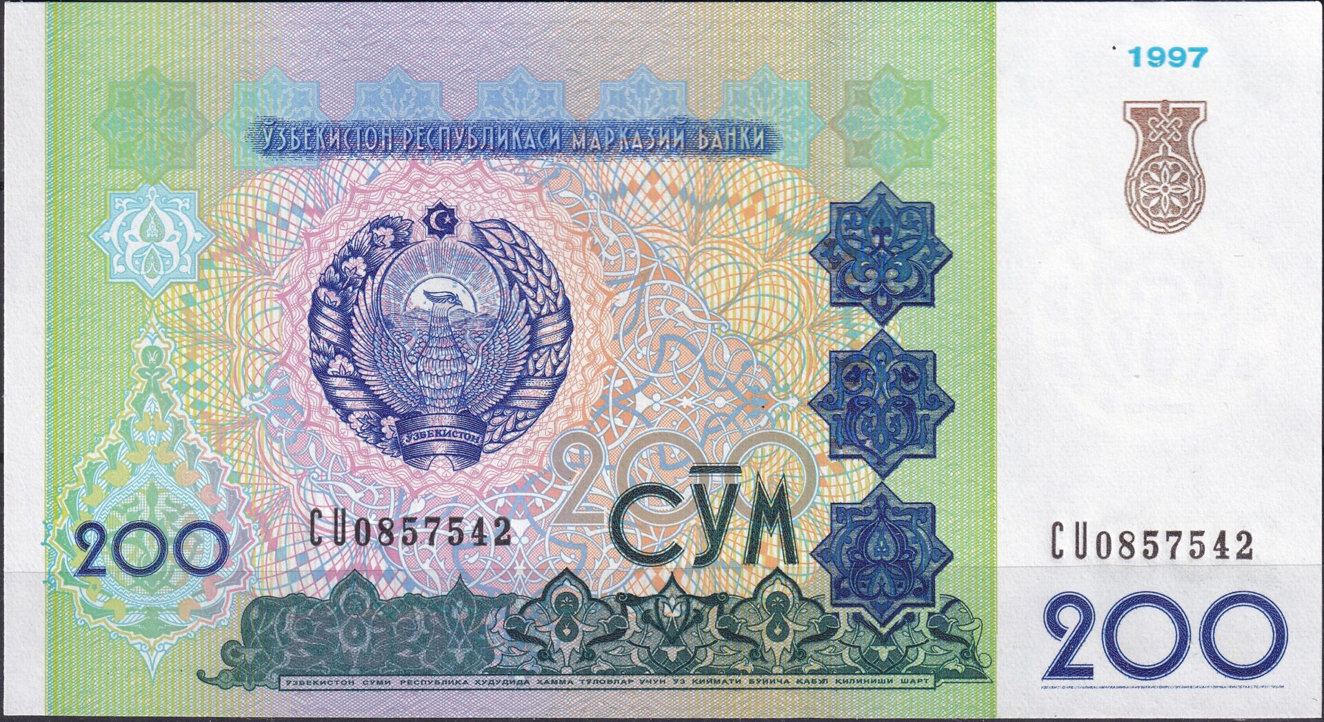 Uzbekistan, 200 Sum udgivet i 1997 af Central Bank of the Republic of Uzbekistan. Katalogiseret som Pick P-79.