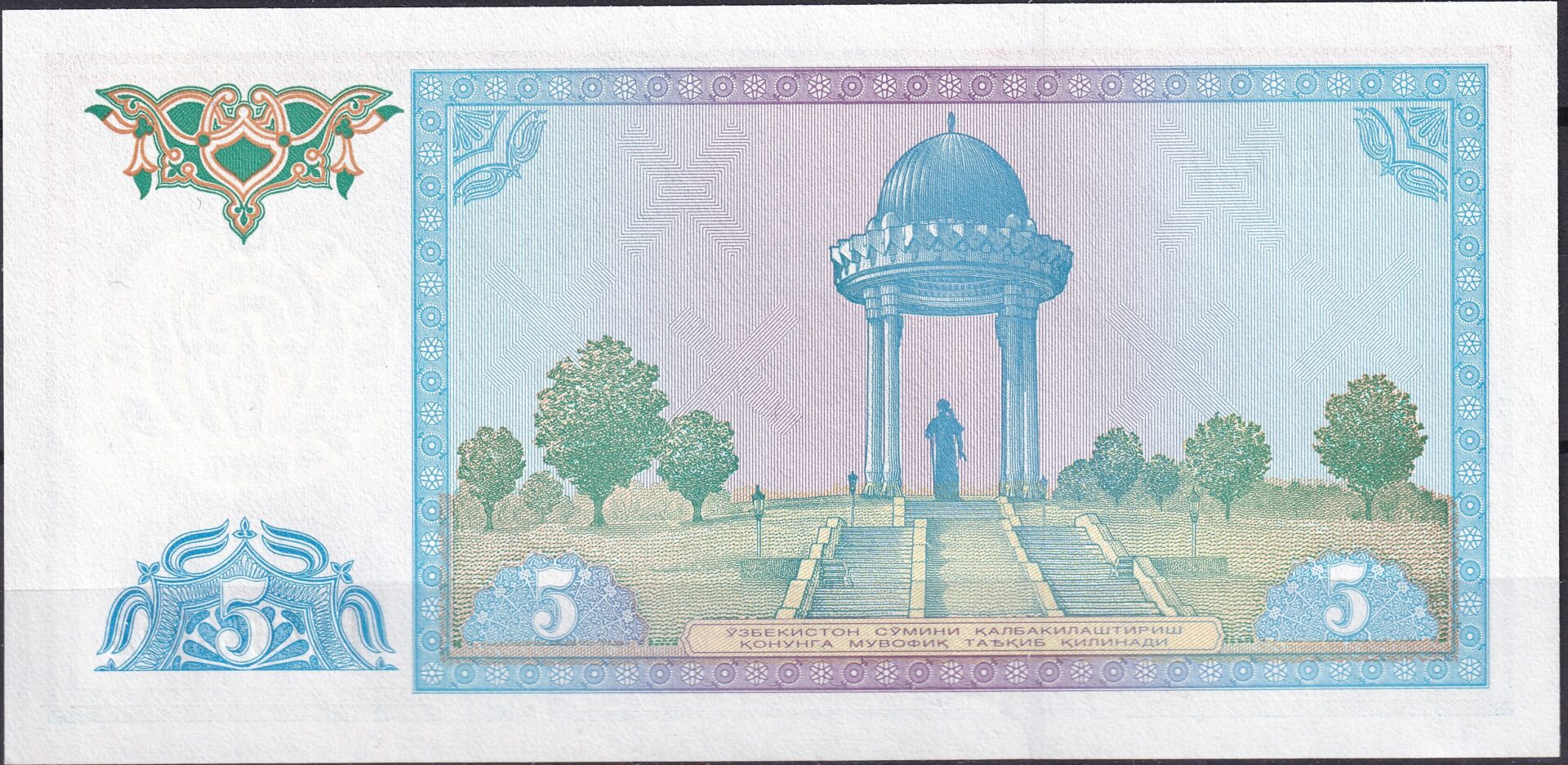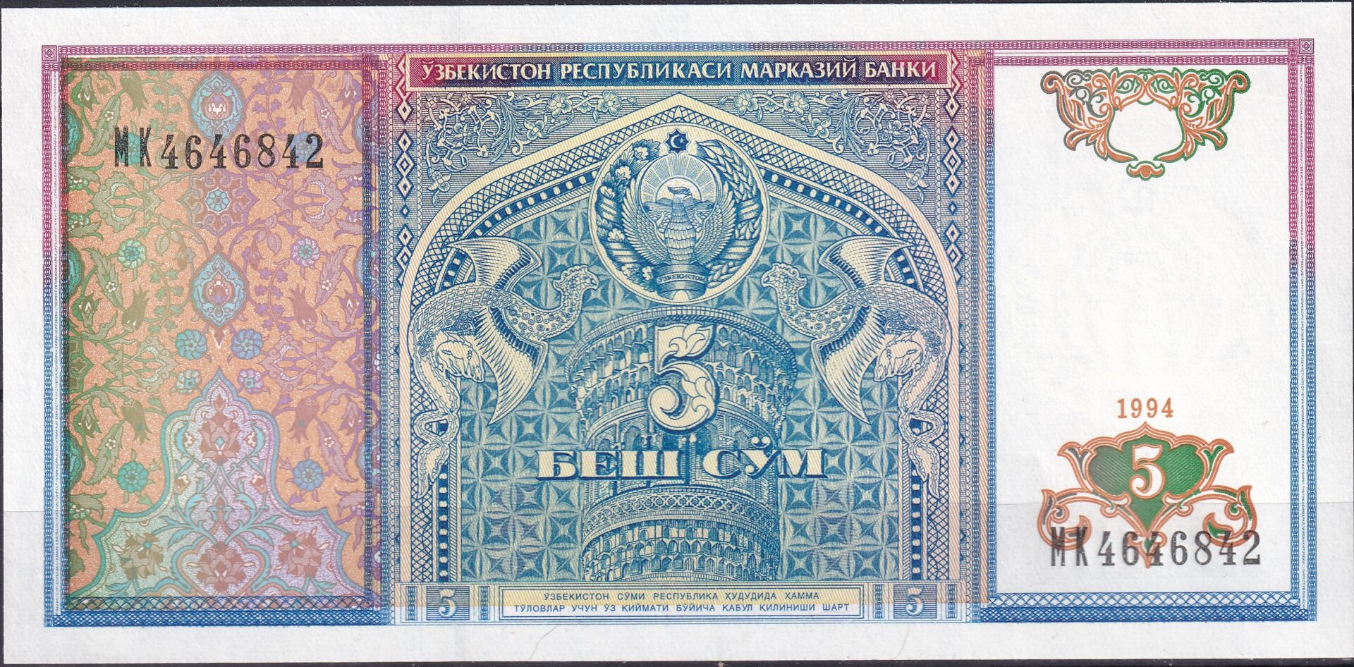 Uzbekistan, 5 Sum udgivet i 1994 af Central Bank of the Republic of Uzbekistan. Katalogiseret som Pick P-77.