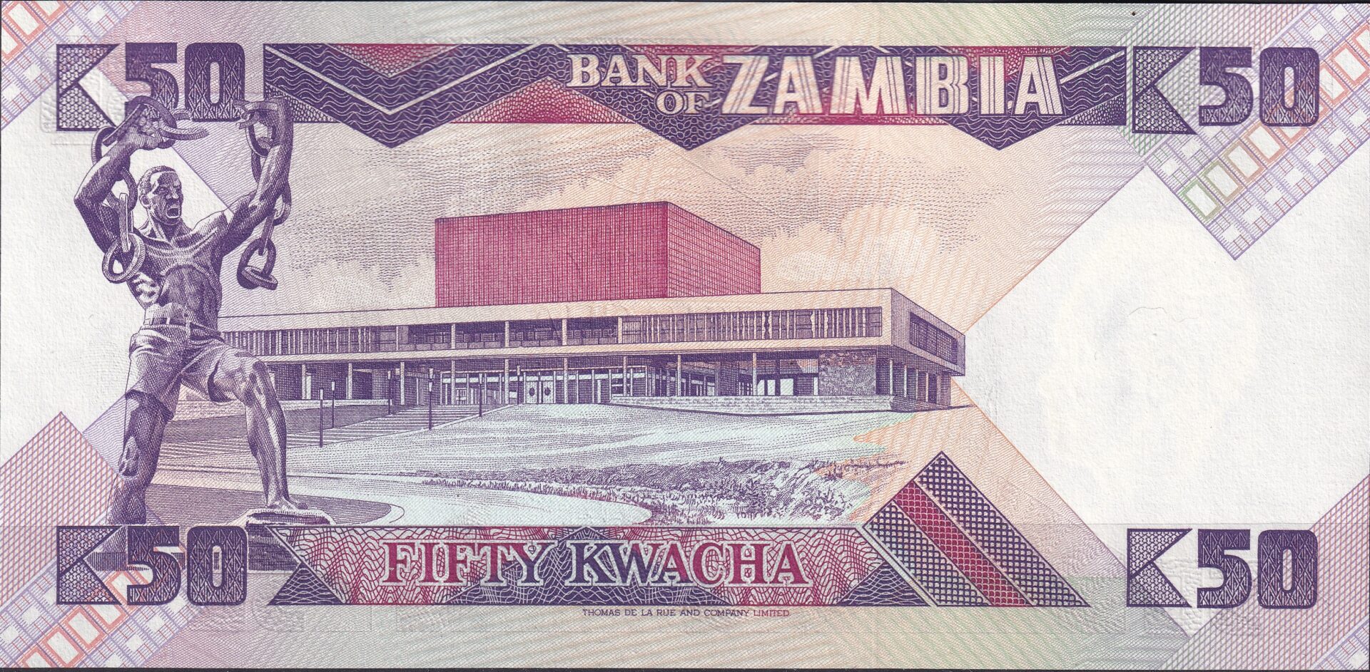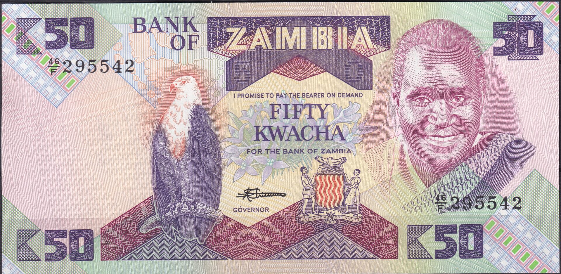 Zambia, 50 Kwacha udgivet af Bank of Zambia. Katalogiseret som Pick P-32 (ældre serie før valutareform).